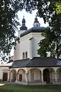 Nova Štifta is best known for its pilgrimage church dedicated to the Assumption of Mary. It is a Baroque church with an exterior arcade. It was built between 1641 and 1671[4] and was commissioned by the Jurij Khisl, lord of the castle in Ribnica, after a mysterious light appeared at Juniper Hill (Brinov vrh, 622 meters or 2,041 feet), as the site is known. The church has an octagonal nave and a smaller square chancel with beveled corners. The cupola rises 27 meters (89 ft) and is topped by a belfry with a Baroque roof. The church is probably based on the Renaissance Coronation of the Virgin Church in Lodi, Italy, which was a model for many later churches in Slovenia.[5]