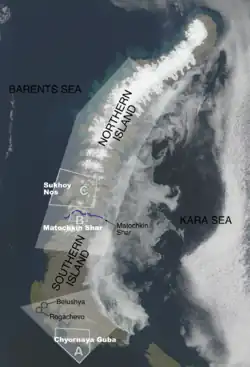 Novaya Zemlya consists of two main islands, the northern Severny Island and the southern Yuzhny Island, which are separated by the Matochkin Strait. Administratively, it is incorporated as Novaya Zemlya District, one of the twenty-one in Arkhangelsk Oblast, Russia.[3] Municipally, it is incorporated as Novaya Zemlya Urban Okrug.[4]