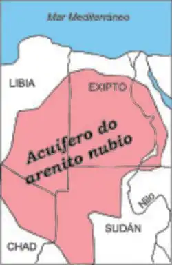 The Nubian Sandstone Aquifer System (NSAS) is the world's largest known fossil water aquifer system. It is located underground in the Eastern end of the Sahara desert and spans the political boundaries of four countries in north-eastern Africa.[1] NSAS covers a land area spanning just over 2 million km2, including north-western Sudan, north-eastern Chad, south-eastern Libya, and most of Egypt. Containing an estimated 150,000 km3 of groundwater,[2] the significance of the NSAS as a potential water resource for future development programs in these countries is large. The Great Man-Made River (GMMR) project in Libya makes use of the system, extracting substantial amounts of water from this aquifer, removing an estimated 2.4 km3 of fresh water for consumption and agriculture per year.