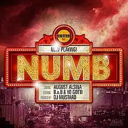 "Numb" is a song by American singer August Alsina, released on December 10, 2013, as the third single from his debut studio album Testimony (2014). The song was produced by DJ Mustard and features guest appearances from American rappers B.o.B and Yo Gotti. When it was originally released in October 2013 it featured West Coast rappers Iamsu! and Problem.[1] The song has since peaked at number 39 on the US Billboard Hot R&B/Hip-Hop Songs.