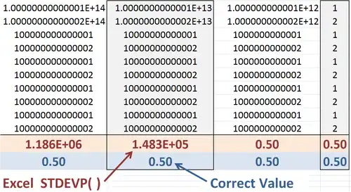 Both the "compatibility" function STDEVP and the "consistency" function STDEV.P in Excel 2010 return the 0.5 population standard deviation for the given set of values. However, numerical inaccuracy still can be shown using this example by extending the existing figure to include 1015, whereupon the erroneous standard deviation found by Excel 2010 will be zero.
