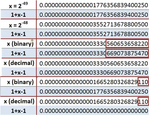 The last two examples illustrate what happens if x is a rather small number. In the second from last example, x = 1.110111⋯111 × 2−50 ; 15 bits altogether. The binary is replaced very crudely by a single power of 2 (in this example, 2−49) and its decimal equivalent is used. In the bottom example, a decimal identical with the binary above to the precision shown, is nonetheless approximated differently from the binary, and is eliminated by truncation to 15 significant figures, making no contribution to 1 + x − 1 , leading to x = 0 .[b]