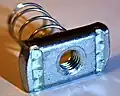 Used with strut to join things to the open face thereof. The grooves in its face engage the lips of the open side of the strut channel, while the spring pushes against the opposite side, to hold the nut in place. | |