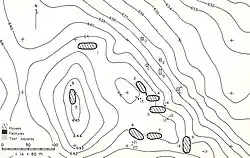 An additional 55 features were identified in the 1979 excavations. They noted little variation in most of the pits and they may be interpreted as fire, storage or refuse pits.[1] Feature 125 in particular was noted to be a roasting pit similar to those found at other Upper Mississippian-affiliated sites of Zimmerman,[3][4] Rader,[5] Knoll Spring,[6] Schwerdt,[7][8][9] Elam,[7][8] Griesmer[10] and Moccasin Bluff.[11] At Griesmer the carbonized remains of white water lily (Nymphaea odorata) tubers were recovered and at Schwerdt and Elam, the carbonized remains of American Lotus (Nelumbo lutea)tubers were recovered from this type of roasting pit.[1][10][7][8][9]