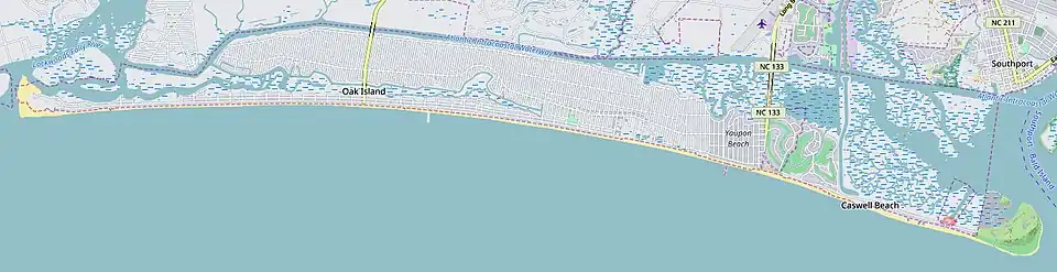 Oak Island is located on the Atlantic Ocean coast in Brunswick County, North Carolina near the South Carolina border. A barrier island, it contains the towns of Oak Island and Caswell Beach, Fort Caswell (since 1949 home to the North Carolina Baptist Assembly) and the Oak Island Coast Guard Station which is co-located with the Oak Island Lighthouse. Almost 13 miles long, the island averages about one mile wide. As of 2020 the island had 8,791 permanent residents,[1][2] while the summertime population can swell to nearly 50,000.[3]