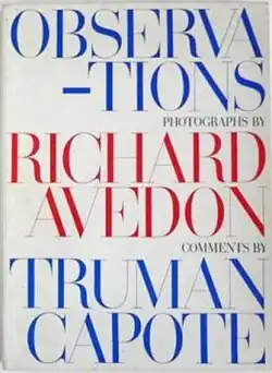 Observations is a collaborative coffee table book with photography by Richard Avedon, commentary by Truman Capote and design by Alexey Brodovitch. It features a slipcase with color, all-capitalized lettering; the book itself is further housed in a clear acetate/glassine slip cover and is printed with the same bold design as the slipcase in black-and-white. Simon & Schuster published the work in 1959 having it printed using the photogravure method in Lucerne, Switzerland.