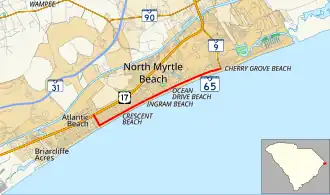 SC 65 begins at U.S. Route 17 (US 17) in North Myrtle Beach, near Atlantic Beach. It travels southeast along 27th Avenue South, heading one block towards the shoreline before turning northeast at South Ocean Boulevard, paralleling the ocean and shoreline businesses for the next 3+12 miles (5.6 km), including an intersection with Main Street. At the intersection with South Carolina Highway 9, SC 65 ends within the community of Cherry Grove Beach.[2]