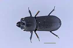 Odontotaenius disjunctus, the patent-leather beetle or horned passalus, is a saproxylic beetle in the family Passalidae (bess beetles) which can grow to over 3 cm long, weigh 1-2 grams and are capable of pulling 50 times their own weight.[2] They have been used to study several aspects of general family characteristics since the early 1900s but remain a relatively unknown species within the diverse Coleoptera order.