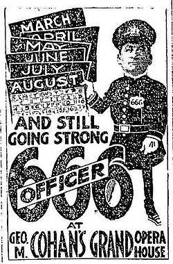 - ^ "'OFFICER 666' FARCE OF MANY SURPRISES; New Play at the Gaiety Has Lots of Humorous Situations and Bright Dialogue. MISTAKEN IDENTITY PLOT George Nash as Burglar Who Poses as Artist and Wallace Eddinger as Bogus Policeman Score. (Published 1912)". The New York Times. 30 January 1912. Archived from the original on 26 July 2018.