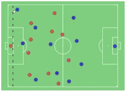 The blue forward on the left of the diagram is in an offside position as he is in front of both the second-to-last defender (marked by the dotted line) and the ball. Note that this does not necessarily mean he is committing an offside offence; it only becomes an offence if the ball were to be played to him at this moment, whether or not he is in an offside position when he receives the ball, as he could receive the ball in an onside position but he'd still have committed an offside offence.
