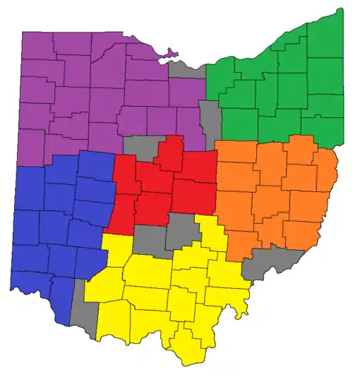 The six OHSAA regions with the Central in red, the East in orange, Northeast in green, Northwest in purple, Southeast in yellow, and Southwest in blue. Counties that are in gray are split between two regions.