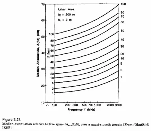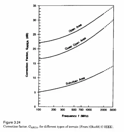 Plots of Amu(f, d) and GAREA for a wide range of frequencies are shown in Figure 3,23 and Figure 3.24. Furthermore, Okumura found that G(hte) varies at a rate of 20 dB/decade and G(hre) varies at a rate of 10 dB/decade for heights less than 3 m.