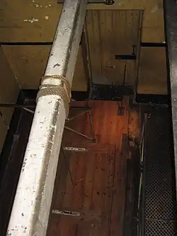 After 1864 a fixed gallows was installed below the octagon across the main axis of the prison block, against the wall dividing the male block from the female block. It comprised a single-leaf trap cut into the metal walkway, with iron sockets in either wall above, into which the beam was placed for each hanging (a common design, used in other Victorian gaols at Ararat, Geelong, Beechworth, Ballarat, Bendigo, Castlemaine, Melbourne and Pentridge; and interstate at Adelaide and Long Bay, New South Wales). It was later moved a few metres to a side gallery below the octagon, where it remains today.[15]