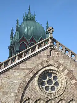 Centered above the Sanctuary on the east side of the church is a copper clad cupola surrounded by twelve ornate gothic arched windows. This feature is reminiscent of the cupolas of the Basilica of St. Mark in Venice. While the lantern provides a striking visual presence, it was also built with function in mind. In the days before mechanical fans and air conditioning, a series of mechanically operated louvers allowed for window panels to be opened to help cool the sanctuary inside.