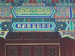 As Bucknell et al. (1986, p. 15) say, the complete Avalokiteshvara Mantra includes a final hrīḥ (Sanskrit: ह्रीः, IPA: [ɦɽiːh]), which is iconographically depicted in the central space of the syllabic mandala as seen in the ceiling decoration of the Potala Palace.[43] The full mantra in Tibetan is thus: ཨོཾ་མ་ཎི་པདྨེ་ཧཱུྃ་ཧྲཱིཿ The hrīḥ is not always vocalized audibly and may be resonated "internally" or "secretly" through intentionality.