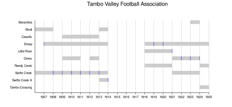 The mainstays of the early football competitions up to the ODFA were Swifts Creek and Omeo, with Long Gully/Cassilis, Benambra, and Ensay also fielding teams in some or most years. In 1907 the competition split into two branches. The ODFA continued as an 'above the gap' competition involving Omeo, Benambra, and Cassilis, while a new 'below the gap' competition, the Tambo Valley Football Association (TVFA), was formed by Swifts Creek, Ensay, and a new team from the small locality at Bindi.[7][8][15][16] At this time roads were poor and transport options limited, making the 70 km between Benambra and Ensay for example very significant, so presumably this split was largely to help with travel as the competition expanded to more clubs over a larger area.