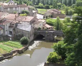 On the back of the painting On a French River, the following words are inscribed: "A.P. Parthenay, France 215" or "At Parthenay, France / 215."[1] Indicating that the painting depicts a town located in the Nouvelle-Aquitaine region in western France. The river Thouet flows through the town of Parthenay with medieval bridges spanning over it.