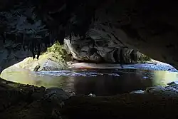 Moria Gate Arch is 19 m high and 43 m wide[1] and its ceiling is extensively covered with stalactites and roots. The center portion of the river cave is spacious and its floor covered in sand accumulated by the Ōpārara River flowing through it, making it easy to explore the cave along the river's edge to both entrances.