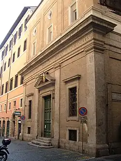 The current oratory was built by the Jesuit Pietro Gravita, from 1631-1633, with the financial support of a number of noble families who resided in the neighborhood near the Pantheon.[5] Construction was inaugurated on 8 September 1631 with the blessing of Bishop Emilio Altieri, an alumnus of the Collegio Romano and Bishop of Camerino, La Marche, from 1627-1666. Created a cardinal in 1669, Bishop Altieri was elected Pope Clement X in 1670.[1][4]