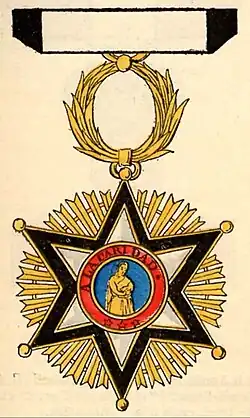 The Cross of Epidemics was established by royal order of August 15, 1838, and the Civil Order of Beneficence was created by royal decree of May 17, 1856. Both honorary distinctions were merged by royal decree of the Ministry of the Interior on July 29, 1910, remaining under the name of the Civil Order of Beneficence.[1] Its purpose was to reward relevant services and merits of a sanitary nature, or those rendered due to assistance in sanitary struggles or epidemics.[2][3][4][5][6]