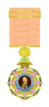 - Insignia consists of a pendant only. The pendant design is similar to that for a Knight Commander, but of smaller size. It is suspended from a pink silk band 4 cm wide, with an additional rosette, to wear on the left chest.