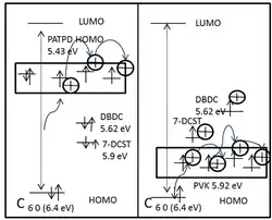 Besides the mobility, the ionization potential of the polymer and the respective dopant has also significant importance. The relative position of the polymer HOMO with respect to the ionization potential of the other components of the blends determines the extent of extrinsic hole traps in the material.[17] TPD (tetraphenyldiaminophenyl) based materials are known to exhibit higher charge carrier mobilities and lower ionization potentials compare to carbazole based (PVK) materials. The low ionization potentials of the TPD based materials greatly enhance the photoconductivity of the materials. This is partly due to the enhanced complexation of the hole conductor, which is an electron donor, with the sensitizing agents, which is an electron acceptor. It was reported a dramatic increase of the photogeneration efficiency from 0.3% to 100% by lowering the ionization potential from 5.90 eV (PVK) to 5.39 eV ( TPD derivative PATPD).[18] This is schematically explained in the diagram using the electronic states of PVK and PATPD.