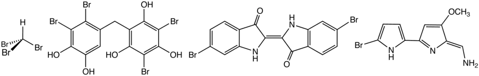 Structure of some naturally-occurring organobromine compounds. From left: bromoform, a brominated bisphenol, dibromoindigo (Tyrian purple), and the antifeedant tambjamine B.