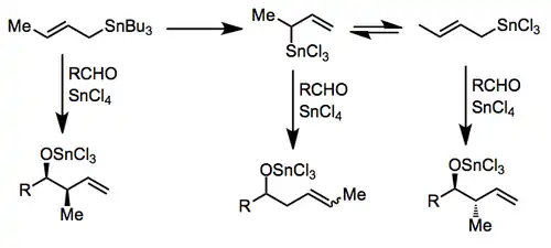 With the allylstannane and aldehyde in high-temperature conditions, addition proceeds through a six-membered, cyclic transition state, with the tin center serving as an organizing element. The configuration of the double bond in the allylstannane controls the sense of diastereoselectivity of the reaction.[4]
