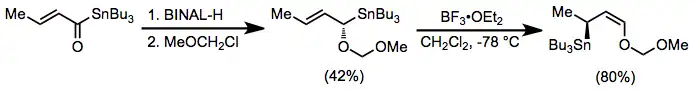 The possibility of incorporating oxygen-containing substituents into allyl- and allenylstannanes expands their scope and utility substantially over methods relying on more reactive organometallics. These compounds are usually prepared by enantioselective reduction with a chiral reducing agent such as BINAL-H.[9] In the presence of a Lewis acid, isomerization of α-alkoxy allylstannanes to the corresponding γ-alkoxy isomers takes place.[10]