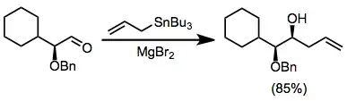 The use of chiral electrophiles is common and can provide "double diastereoselection" if the stannane is also chiral.[11] Chelation control using Lewis acids such as magnesium bromide can lead to high stereoselectivities for reactions of α-alkoxy aldehydes.[12]