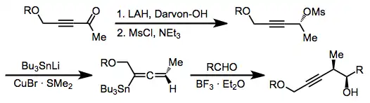 Nucleophilic addition to propargyl mesylates or tosylates is used to form allenylstannanes.[13] These compounds react similarly to allylstannanes to afford homopropargyl alcohols, and any of the three reaction modes described above can be used with this class of reagents as well.