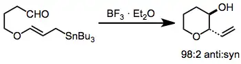 Repeated use of the allylic stannane addition in an intramolecular sense was used in the synthesis of hemibrevetoxin B (one example is shown below). The pseudoequatorial positions of both "appendages" in the starting material lead to the observed stereoisomer.[17]