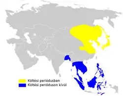 The breeding range covers southern Siberia, Mongolia, northern, central and eastern China, Korea and Japan. It winters in north-east India and across South-east Asia to the Philippines and Indonesia, occasionally reaching New Guinea and Australia. It has occurred as a vagrant in Israel and Kuwait. It breeds mainly in reedbeds and can also be found in marshes, paddy fields, grassland and scrub where it forages for insects and other invertebrates.