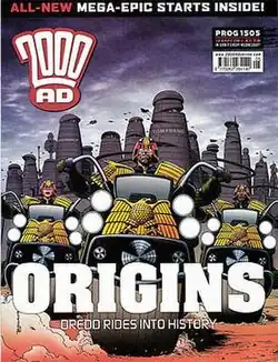 ![]() Cover of 2000 AD prog. 1505 (Sept 13 2006), art by Brian Bolland. Issue containing the first episode of "Origins." | |