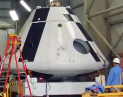 The Orion crew module (CM) is a reusable transportation capsule that provides a habitat for the crew, provides storage for consumables and research instruments, and contains the docking port for crew transfers.[13][14][15] The crew module is the only part of the spacecraft that returns to Earth after each mission and is a 57.5° frustum shape with a blunt spherical aft end, 5.02 meters (16 ft 6 in) in diameter and 3.3 meters (10 ft 10 in) in length,[16] with a mass of about 8.5 metric tons (19,000 lb). It was manufactured by the Lockheed Martin Corporation at Michoud Assembly Facility in New Orleans, Louisiana.[17][18][19][20] It has 50% more volume than the Apollo capsule and will carry four astronauts.[1] After extensive study, NASA selected the Avcoat ablator system to provide heat protection encountered during reentry for the Orion crew module. Avcoat, which is composed of silica fibers with a resin in a honeycomb made of fiberglass and phenolic resin, was formerly used on the Apollo missions and on the Space Shuttle orbiter for early flights.[21]