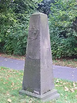 In 1818, a Prussian all-mile obelisk made of trachyte stone was erected at the corner of Bensheimer Street and Frankfurter Street. From this milestone the distance to Cologne is one Prussian mile (7532,48 m). Due to the soft stone, the monument is heavily weathered and in need of restoration. During an earlier restoration attempt, the last "e" of mile was removed, so the inscription below the Prussian eagle now reads, "Cöln 1 Meil."[39]