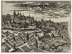 During the rule of King Ottokar II, the settlement became a royal town. This lasted until the 15th century, when the Schlick family bought the town. In 1625, the town was acquired by Julius Henry, Duke of Saxe-Lauenburg. He decided to make Ostrov the residence of his house. He had rebuilt Ostrov Castle and extended, and founded a Piarist monastery with a Latin school.[3]