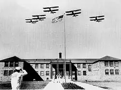 Naval Air Station Ottumwa (NAS Ottumwa) was constructed as a Naval Training Center shortly after America's entry into World War II. The Navy, faced with providing aviators and support personnel for a two-front war, began a massive campaign of rapid expansion. On April 15, 1942, the U.S. Navy Site Selection Board met with Ottumwa city officials and determined a 1,400-acre tract of land a few miles north of the city would be a suitable location for a primary flight training facility. Based on their recommendation, Navy Secretary Frank Knox approved the location on July 9, 1942, and on August 6, 1942, groundbreaking for the base was held.[4] The first group of Naval Aviation Cadets arrived at the base on March 10, 1943, and flight training officially began four days later. Another first for NAS Ottumwa occurred on May 30, 1943, when the first group of U.S. Navy WAVES arrived.[4] At its peak, NAS Ottumwa was averaging one thousand flight hours per day, and over 600,000 flight hours logged by the time the base was closed.[5] Aircraft used in flight training were mostly the SNJ, the N3N Canary, and the N2S Kaydet. Around sixty buildings—hangars, control tower, barracks, classrooms and sundry others—were built for the Navy's use. The base avenues were named for U.S. Navy aircraft carriers that served early in World War II: Enterprise, Hornet, Langley, Lexington, Wasp and Yorktown. Streets were named for U.S. Navy Admirals Dewey, Farragut, Moffett, and Sims along with Marine Corps General Smedley Butler and American Revolutionary War naval hero John Paul Jones.[6]