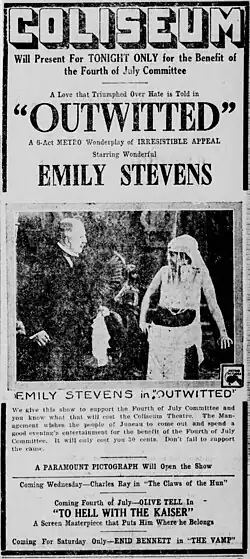 Outwitted is a 1917 American silent drama film, directed by George D. Baker. It stars Emily Stevens, Earle Foxe, and Frank Currier, and was released on November 12, 1917.