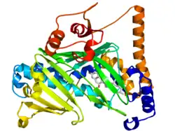 Crystallographic structure of the oxysterol-binding protein (rainbow color cartoon, N-terminus = blue, C-terminus = red) bound to 7-hydroxycholesterol (stick diagram, carbon = white, oxygen = red).[1]