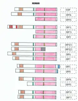 In humans there are 12 ORP genes, and splicing generates 16 different protein products.[14][15] [16]