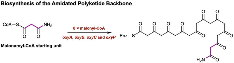 The biosynthesis of oxytetracycline begins with the utilization of PKS enzymes ketosynthase (KS), the chain length factor (CLF), the acyl carrier protein (ACP), and an acyltransferase (encoded as OxyA, OxyB, OxyC and OxyP in the oxytetracycline gene cluster)[8] to catalyze the extension of the malonamyl-CoA starting unit with eight malonyl-CoA extender units. The process of elongating the polypeptide skeleton occurs through a series of Claisen-like decarboxylation reactions until the linear tetracyclic skeleton is formed.[9] Thus, minimal PKSs form a completed amidated polyketide backbone without any additional post-synthase tailoring enzymes (Figure 1).