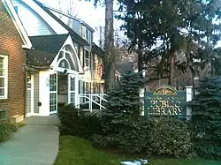 To the right is a frame house built around 1890 which for many generations was a doctor's office. It was purchased by the library and connected to the original building in 1975.[11] This house is often referred to as the Bishop house, named for Dr. Bishop who had a medical practice there. In 1994 the brick and glass additions behind the Bishop House were added on to further expand the facilities which now include a spacious and sunny children's room.[13]
