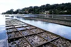 Oyster farming on Georges River, commercial aquaculture of Sydney Rock Oysters, in the Georges River estuary of New South Wales, Australia, occurred between around 1870 and 2023. Production peaked in the 1970s. In the financial year 1976–1977,[1] the river produced 2,563 tonnes of oysters, over a quarter of the record statewide production total of 9,375 tonnes (the state total being equivalent to 204 million individual oysters).[2] Following a series of setbacks after that year, an outbreak of QX disease in 1994, all but totally destroyed the industry on the Georges River; the development of QX-resistant strains came too late to save much of it.[3] In 2023, the last oyster farm in the estuary was forced to close,[4] and its future as an oyster growing area is now uncertain.[5]