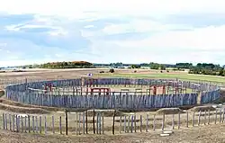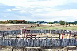 During the Bronze Age, around the late third millennium BCE, Pömmelte was the site of an astronomical observatory (Ringheiligtum Pömmelte) with a function and design similar to Stonehenge, built in wood, with radiocarbon dates indicating 2300 BCE as the earliest phase of the ritual centre.[3][4][5] The Pömmelte observatory/sanctuary is associated with the Bell Beaker culture and subsequent Unetice culture. Speculation among anthropologists in 2018 is considering recognition of a cultural tie broadly throughout Europe and the British Isles associating the traditions from which these structures arose to those much earlier, in places such as such as the 7000-year-old Goseck circle in Germany.[6]