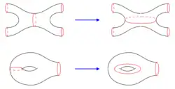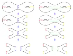 By a recursion argument, this implies that for any surface there is a system of simple closed curves which cut the surface into pairs of pants. This is called a pants decomposition for the surface, and the curves are called the cuffs of the decomposition. This decomposition is not unique, but by quantifying the argument one sees that all pants decompositions of a given surface have the same number of curves, which is exactly the complexity.[1] For connected surfaces a pants decomposition has exactly pants.