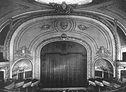 The proscenium arch measures 44 feet (13 m) across.[15][16] It contains pellet, egg-and-dart, and acanthus-leaf moldings surrounding a band of acanthus leaves. The top of the arch consists of a keystone with a molding of a child's head.[56] A sounding board rises above the proscenium arch, with foliate bands at the perimeter. At the center of the sounding board, above the stage, is a circular panel depicting a lyre.[55] The orchestra pit is at the front of the orchestra seating level, in front of the proscenium. It dates from a 1965 renovation and contains high walls.[55] The stage is behind the proscenium arch and orchestra pit.[54] The stage historically had a Wurlitzer Opus 303 organ.[3][61] The orchestra and stage both have stage lifts.[42][62]