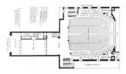 The theater wing measured 88 by 125 feet (27 by 38 m).[10][14] It had a brick or terracotta facade on 47th Street.[9][15] The interior had French decorations.[9] The auditorium originally had a seating capacity of 1,820, with double balcony levels and 20 boxes arranged in tiers.[19] It was characterized as having an ivory-and-bronze color scheme.[15][16][17] Five massive girders spanned the auditorium; each measured 86 feet (26 m) long and 8 feet (2.4 m) deep, weighing 30 short tons (27 long tons; 27 t).[10][14] There were also 32[16] or 36 dressing rooms.[9]