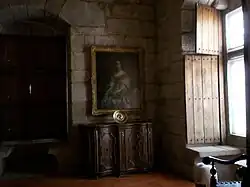 The last floor of the posterior wing is marked by a succession of rooms and the chapel. The chapel has a single nave, which is covered by a wooden ceiling presenting visible joists. A straight narrow wooden choir, allows access to balconies which extend to the front of the church and the exterior facade, as well as the corridors of the remaining wards. The richly carved wood benches in the nave precede the elevated presbytery, which is delimited by a wooden guardrail.