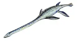Plesiosaurs are present from two different families within Plesiosauroidea in the Niobrara Chalk: the Polycotylidae, or short-necked plesiosaurs, and the Elasmosauridae, or long-necked plesiosaurs. Polycotylids superficially resemble pliosaurs, which are not present within the formation, but are unrelated. They were fast swimmers, unlike the Elasmosaurs that used their long necks to catch fish.[35] Plesiosaurs are rare in the formation and were therefore likely uncommon in the Western Interior Seaway at the time. Specimens become much more numerous in the Pierre Shale situated above the chalk.